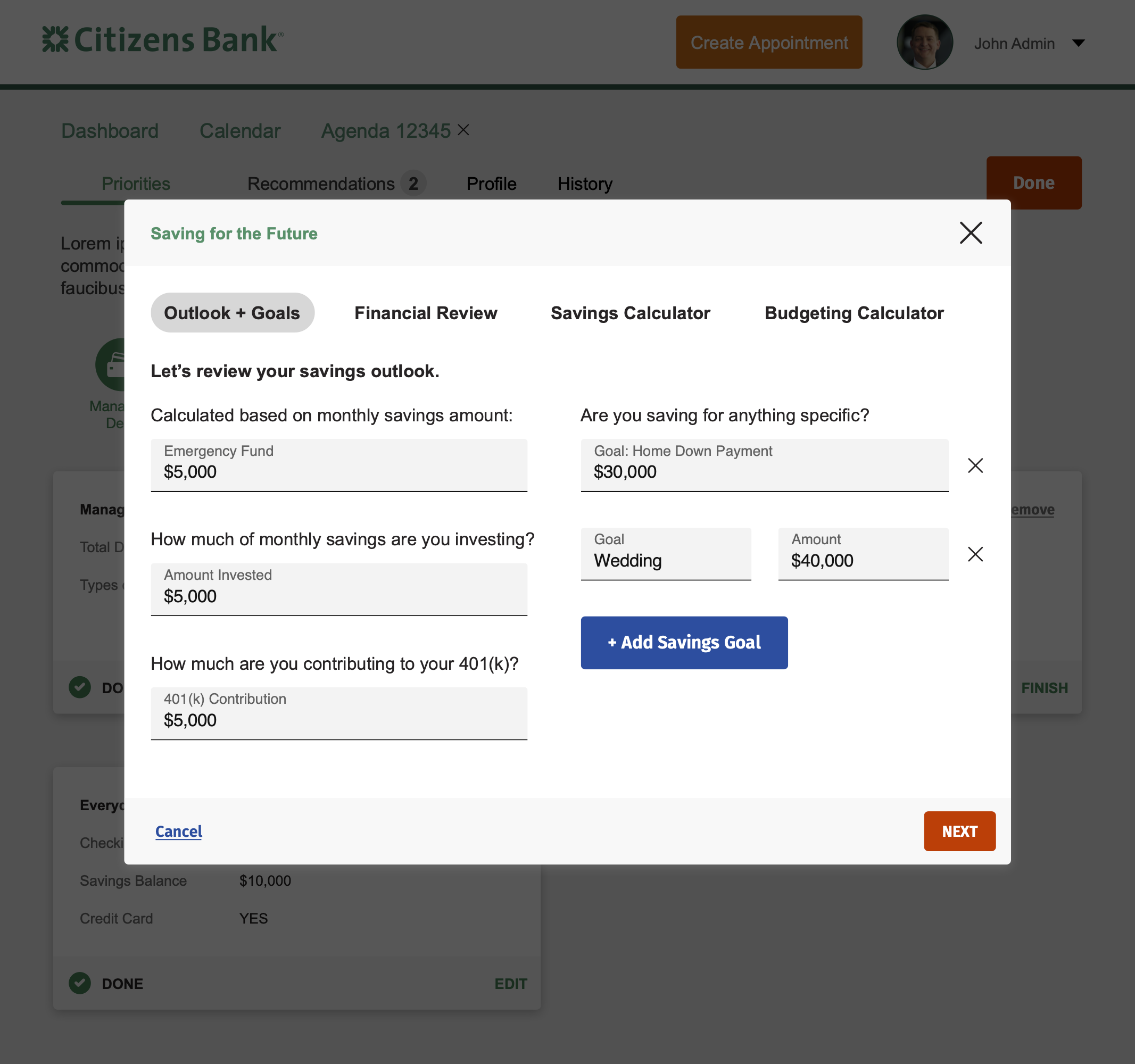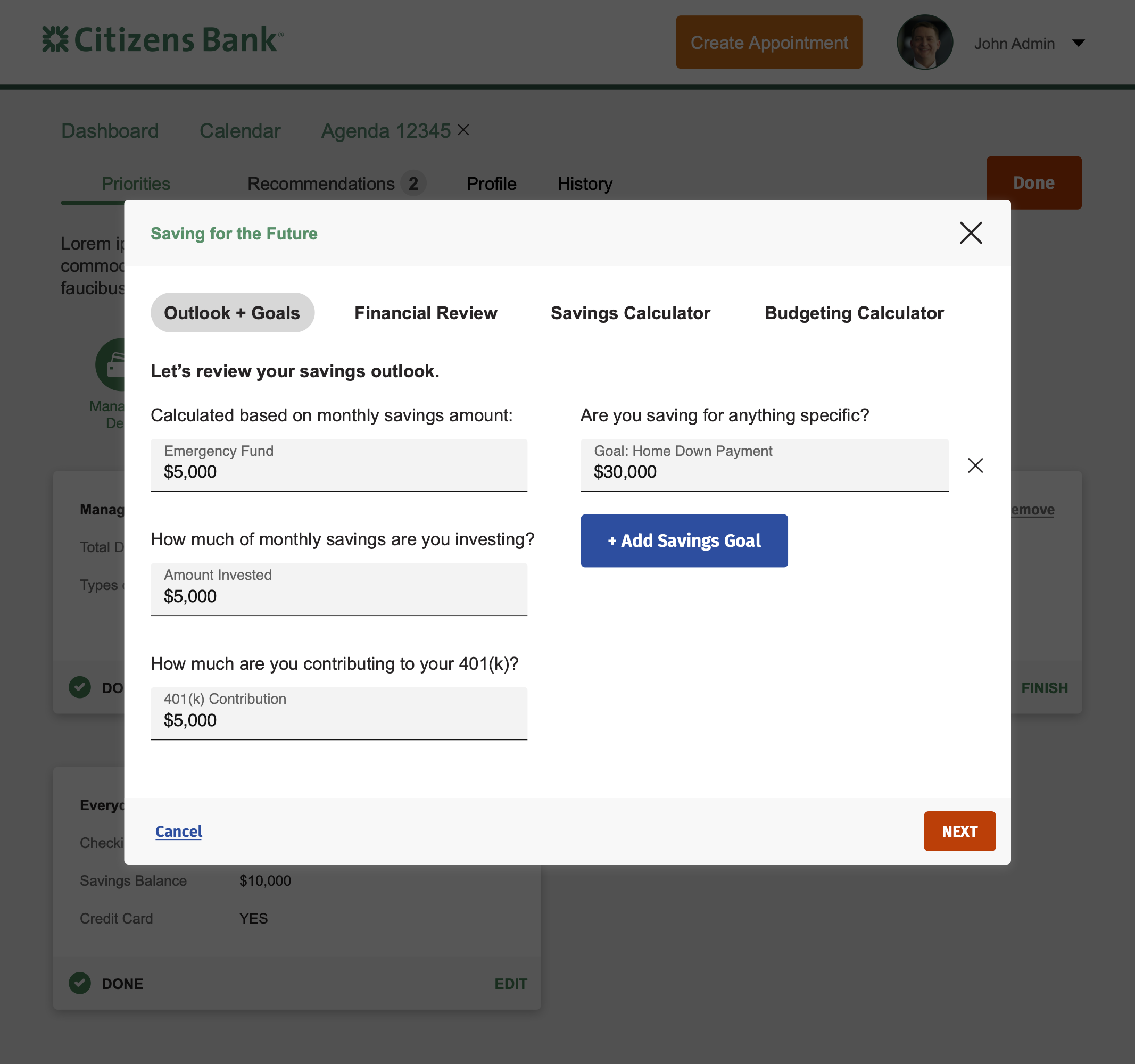 The customer-facing scheduling experience was the first half of the Checkup project. The banker-facing Appointment experience was the second scope of work. This tool allows bankers to review customer provided information in a module based dashboard, and conduct the actual appointment with the customer.