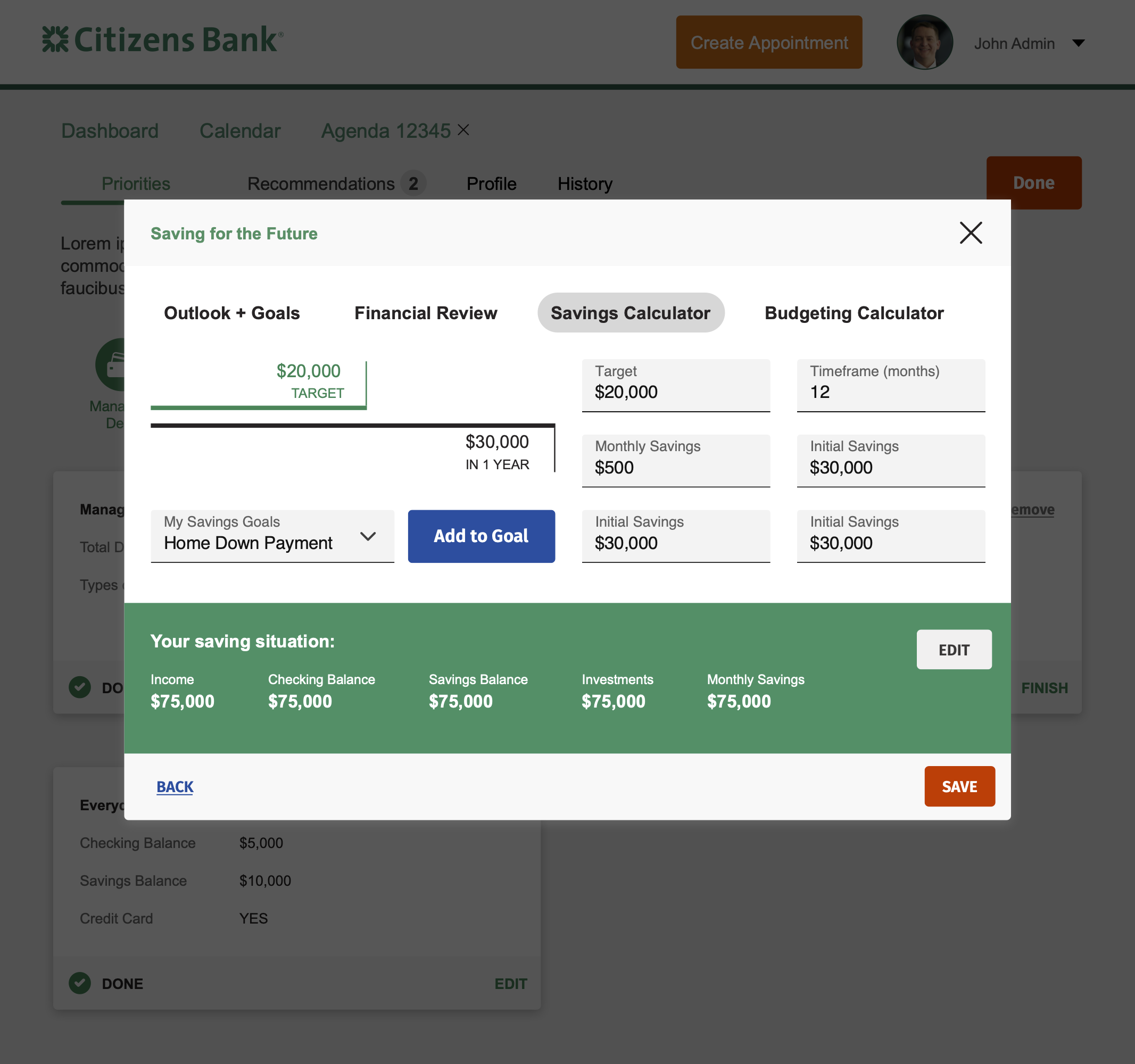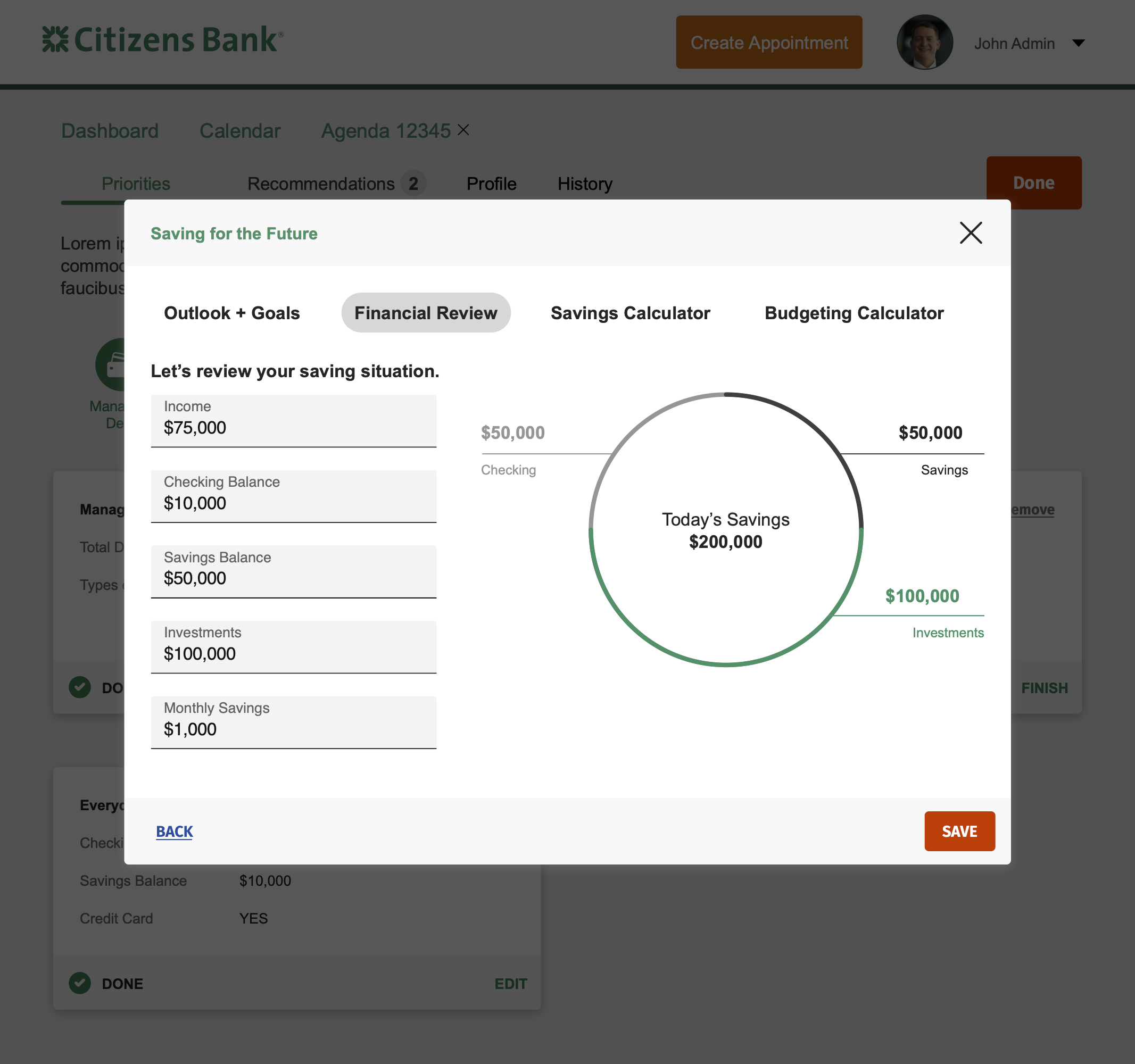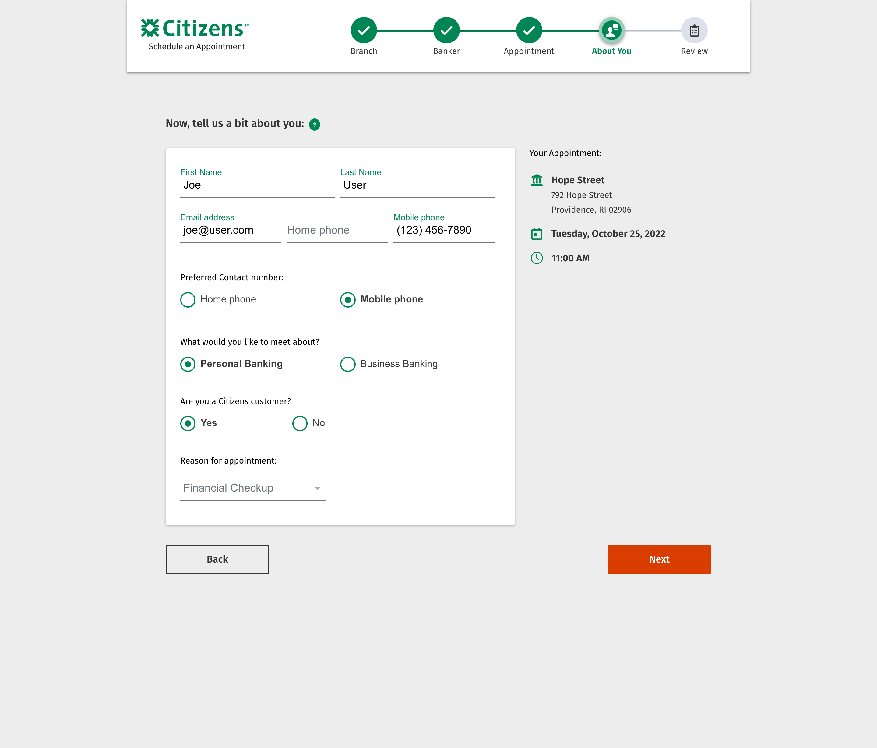 Most of the design work went into refining each module screen. The existing system defined which features were available for the Appointment experience. The refined designs aimed to take advantage of what worked in the existing system, and drop features that did not support the banker or customer journey.