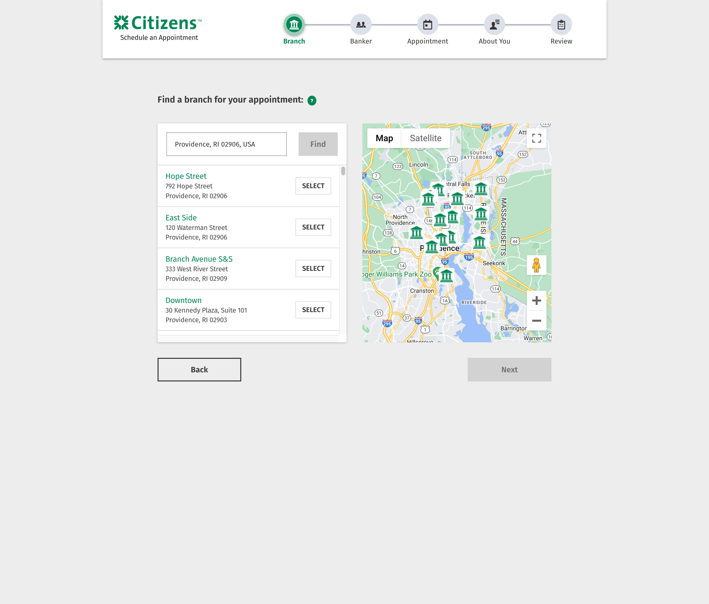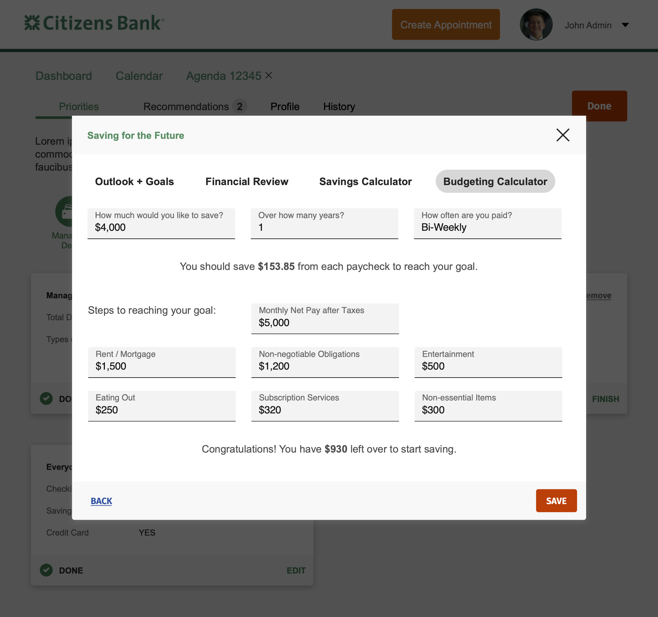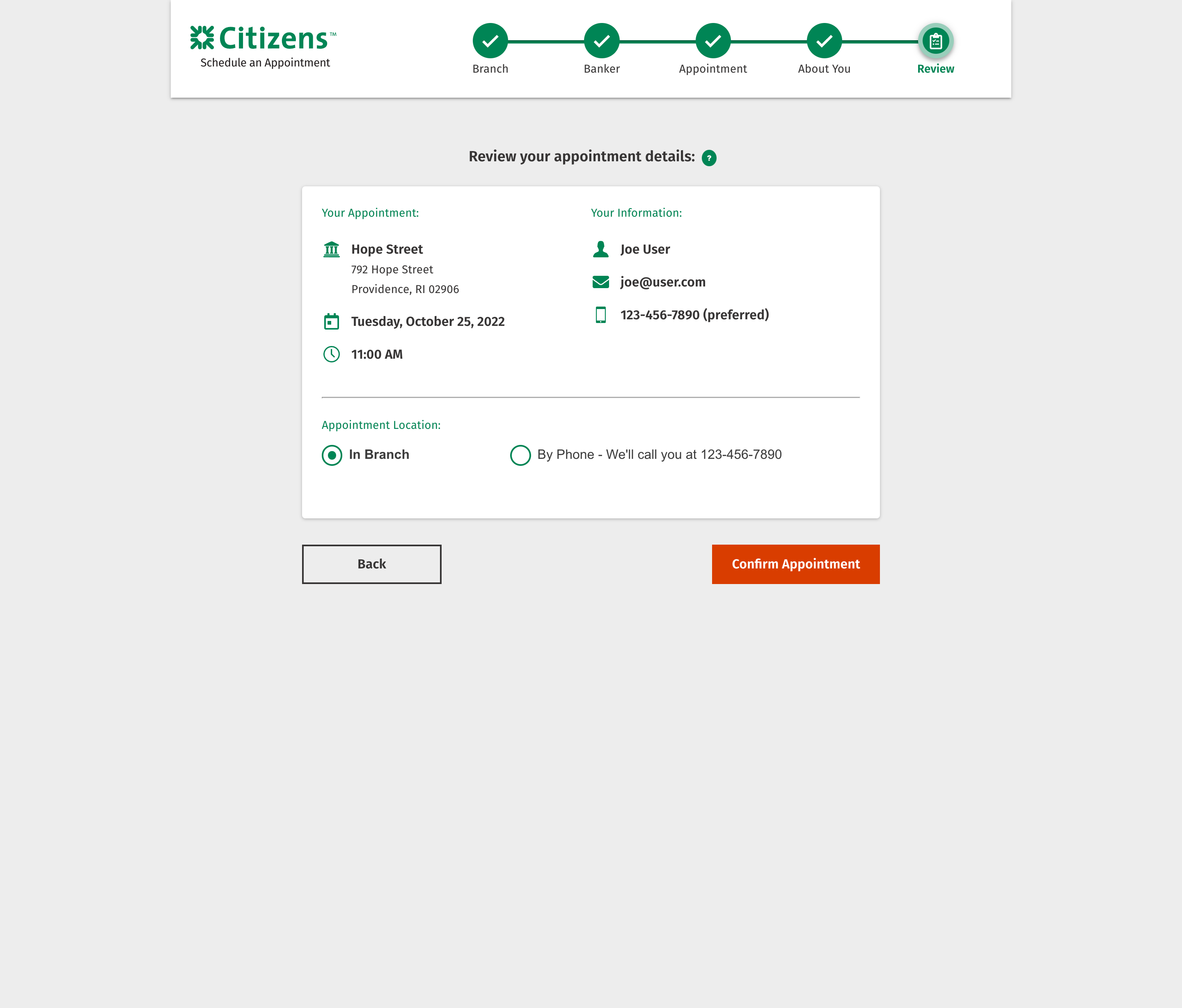 Most of the design work went into refining each module screen. The existing system defined which features were available for the Appointment experience. The refined designs aimed to take advantage of what worked in the existing system, and drop features that did not support the banker or customer journey.